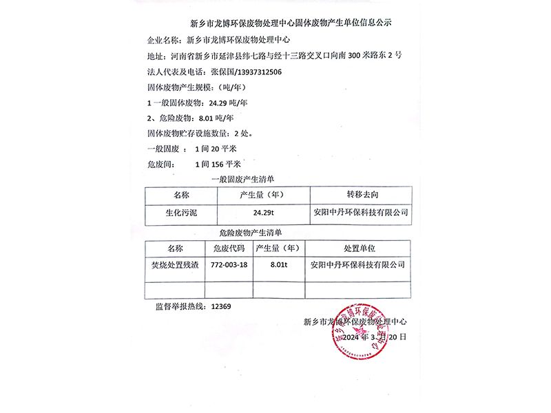 新乡市龙博环保废物处理中心环境信息依法披露公示